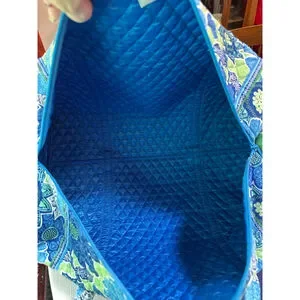 This Vera Bradley quilted travel bag showcases a vibrant blue and green floral and paisley pattern. It features two top handles and a zippered main compartment, revealing a quilted blue interior. The bag's exterior includes side slip pockets. The Vera Bradley brand name is visible on an interior tag and a zipper pull. This pre-owned item is in good condition, with no significant visible imperfections.