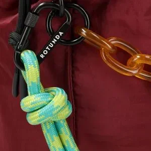 Bordeaux Sant Hobo bag by Rotunda. With room for everything you need and then some, the Sant Hobo Bag is here to hold it all together. Featuring playful details like carabiners, paracord, and chunky acrylic chain, the Sant is an art piece in its own right. Paracord and chain straps are detachable allowing you to choose if you want to wear it long or keep it close. The bag measures 10.21 x 12.6 x 4.7 inches, easily fits a 13" laptop, has two interior pockets (one zippered and another open),