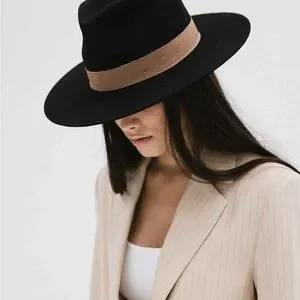 This stylish black hat with a tan band is a must-have accessory for any wardrobe. Perfect for adding a touch of elegance to your outfit.