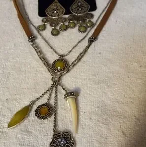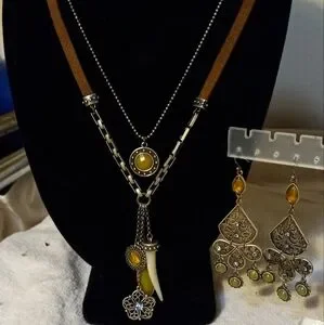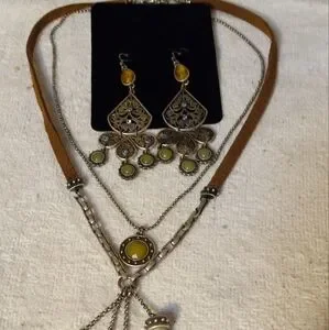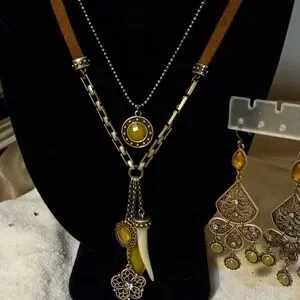 not new,vintage 2 strand attached suede tan with link chain18 inches& fine silver chain with charm necklace is 16 inchesThis exquisite suede necklace strand features mixed media metal& glass stones on 4 separate chains. this jewelry set features a stunning pierced chandelier matching earrings. Perfect for adding a touch of elegance to your fall outfits.