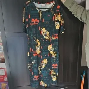 Vibrant LuLaRoe dress with geometric patterns. Eye-catching and stylish.