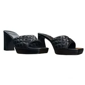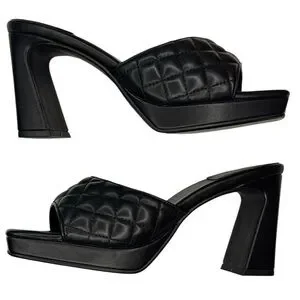 Step out in style with these Jeffrey Campbell chic black quilted platform slide on heels. These stylish mules feature a puffy quilted strap which adds a trendy look to these platform heels. Perfect for any occasion, these shoes offer both comfort and sophistication.