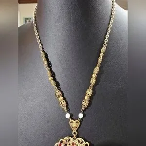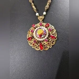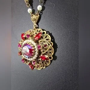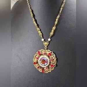 This dazzling vintage Western Germany intricate antique goldtone filigree floral pendant with round red (AB) Aurora Borealis coated centerpiece surrounded by faux pearls and sparkling vibrant accents of red & pink rhinestones necklace