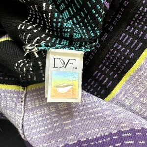 Behold a mesmerizing Diane von Furstenberg dress that promises to elevate your wardrobe with its vibrant charm. This knit dress features a captivating array of purple and teal stripes, accented by subtle hints of yellow, creating a visually stunning and harmonious design. The flattering V-neckline and button-down front add a touch of sophistication, while the 3/4 sleeves offer versatile styling options. A drawstring waist cinches the silhouette, accentuating your figure and providing a comfortable, custom fit. The soft, flexible knit fabric drapes beautifully, ensuring all-day comfort and effortless elegance. Picture yourself wearing this eye-catching dress to a chic brunch, a garden party, or a stylish vacation getaway, making a memorable statement wherever you go.
