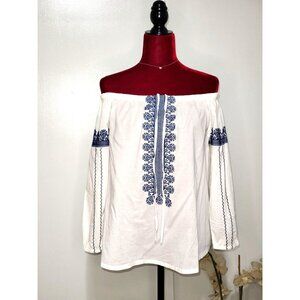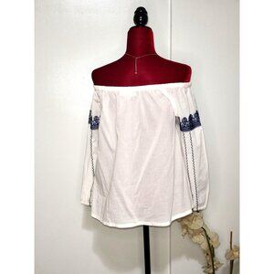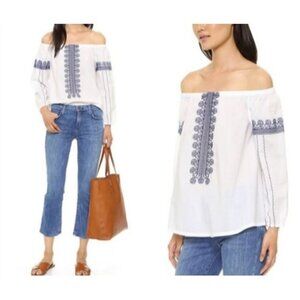 White cotton off shoulder top by Madewell features, elastic top with hidden drawstring to tighten if necessary, 3/4 sleeves with elastic, blue embroidered design.