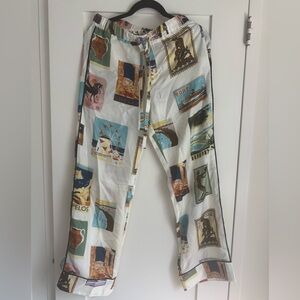 Olivia Von Halle matching set made up of a long-sleeve shirt and pants in Yves Postcard print featuring Greek motifs. Size: XS. Fabric: 100% silk. Never been worn (ended being a size too small).