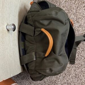 Stylish olive backpack with tan leather details. Ideal for everyday use. With padded back and hidden pocket, plus lots of other organization.