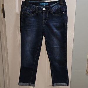Stylish and comfortable cropped jeans. Perfect for any casual occasion. Front and rear pockets. Zipper and button closure. The hem is folded over and stitched to hold in place. Laid out flat the waistband is about 14in. Inseam 20in. Color may vary as pictures were taken with and without flash. Please review all pictures and let me know if you have any questions.