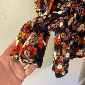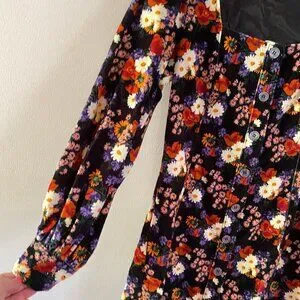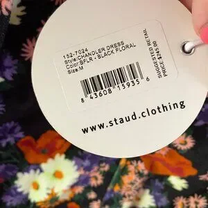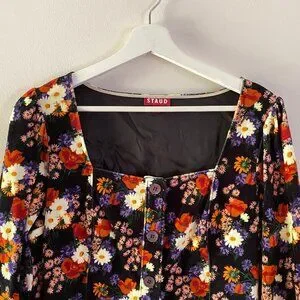 Staud Velvet Chandler dress, Size M, NWT, floral print. No pockets. Buttons through front with square neckline. Slightly puff sleeves with collared cuffs. Really gorgeous print. I believe Kacey Musgraves wore this in different colorway. I saw this on Netflix's 'Dash & Lily' and had to have it! Length from shoulder to hem is 33 inches, armpit to armpit is 17.5 inches. Dress is velvet so better suited to fall and winter wear FYI.