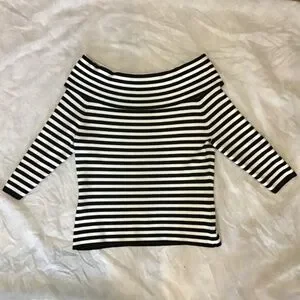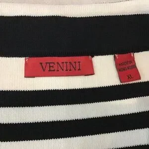 Classic and chic! This Venini rayon sweater features timeless black and white stripes with a swooped neckline for a flattering, feminine touch. Soft, lightweight, and perfect for dressing up or keeping it casual. ✨