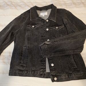 This is a excellent condition woman's black Jean jacket. Size large time and tru. Washed but never worn. Smoke free home. Long sleeve with stretch.