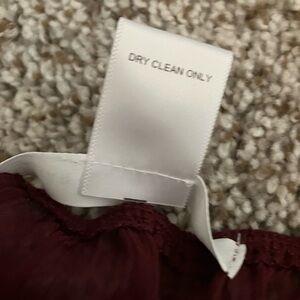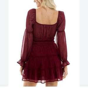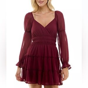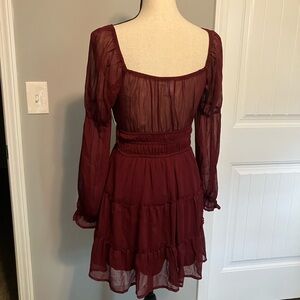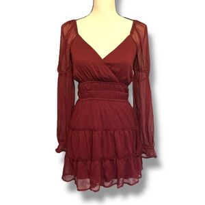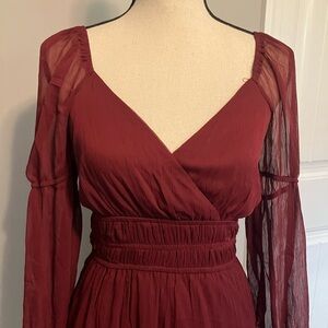 New with tags, chic long sleeve dress with a deep red hue. Flowy and stylish for any event. Bodice is stretchy/elastic banding. Lined front/under skirt.