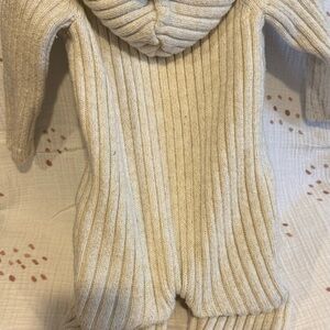 Soft knit bodysuit for babies. Cozy and stylish. Cream and metallic gold. Button down. Lined hood. worn once to stay warm in London. Smoke free home.