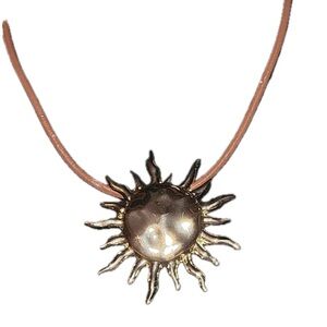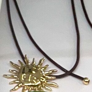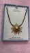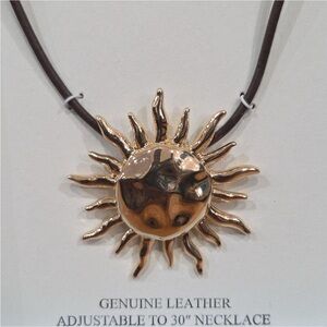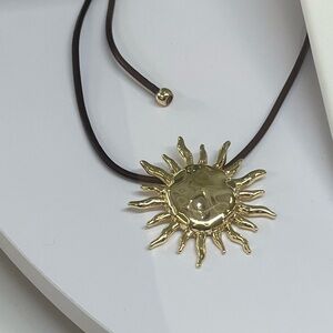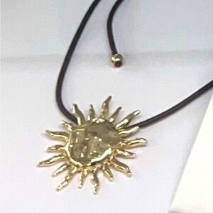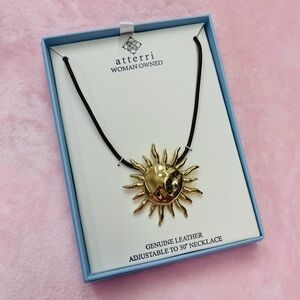 Gorgeous sunburst pendant necklace by ATTERRI features a striking gold design on a brown cord.