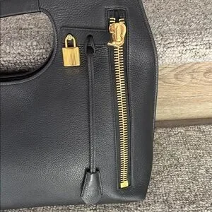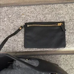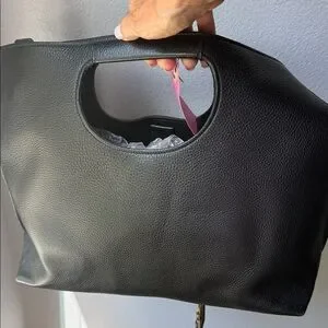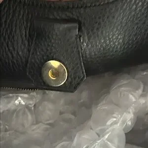 This elegant black leather handbag is perfect for any occasion. Featuring a sleek design with gold accents, it adds a touch of sophistication to your outfit. Ideal for both casual and formal settings. Comes with shoulder strap and interior coin/makeup pouch.