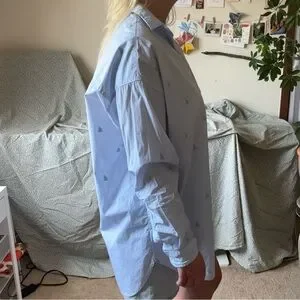 Elevate your style with this classic nautical blue striped shirt with sales boats. Perfect for any occasion.