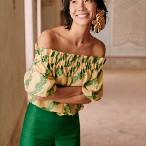 Sezane Macie Off-Shoulder Blouse in Yellow and Green