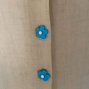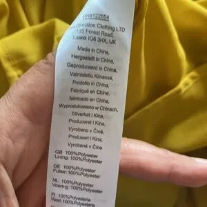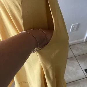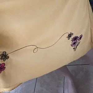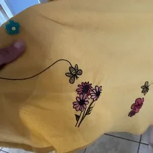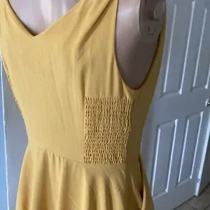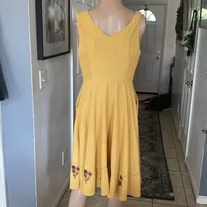 Rich yellow dress with floral buttons. Smocked sides. Bee and floral embroidery on hem.