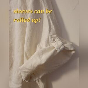 Stylish cream button-down with short sleeves. Features dual front pockets and sleeves that can be rolled up and secured with a button closure. Perfect for casual wear.