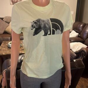 Light green tee with bear graphic. Short sleeves. Casual style.