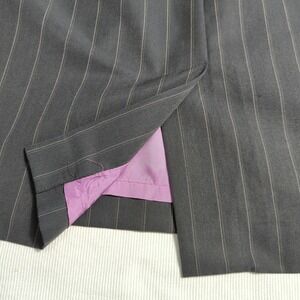 The Nicola Women's Size 10 Gray Striped Double-Breasted Skirt Suit is a stylish and elegant two-piece outfit designed for women. This suit includes a skirt and a jacket with a double-breasted cut, perfect for a classic and sophisticated look. The gray color with white stripes adds a subtle and chic touch to the ensemble, making it perfect for various occasions. The jacket has long sleeves and a chest size of 40 inches, while the skirt has a waist size of 31 inches, ensuring a comfortable and flattering fit for the wearer.