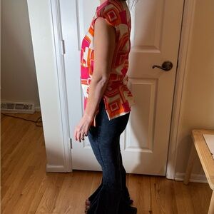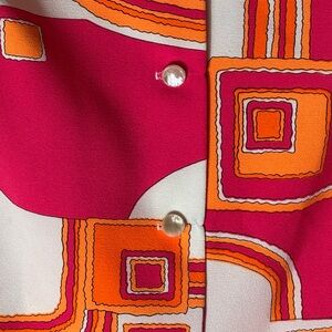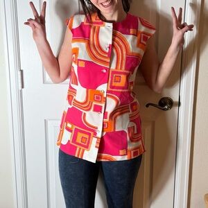 Authentic 1960s/70s vintage Pykettes sleeveless tunic blouse in bold pink, orange & white psychedelic geometric print. Features pearlized front buttons, tunic length cut, and side slits. Fabric feels like classic polyester knit — durable & vibrant.