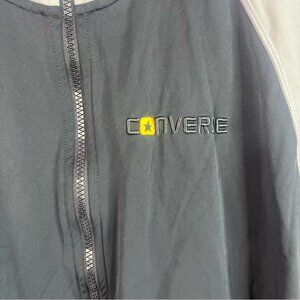 Stylish Converse jacket. Black body with gray sleeves. Yellow stripe detail. Star pattern on shoulders. Full zip front. Medium. .