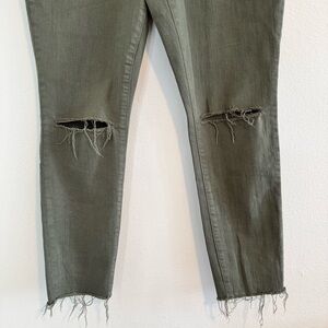 Chic olive jeans with distressed knees. Ankle length for a modern look. Perfect for everyday wear.