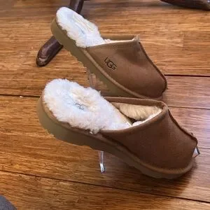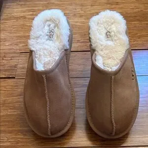 Soft tan suede slippers with plush white lining. Ideal for cozy comfort. Size kids 3. Women’s Uggs are too big for my size 5 feet, so I wear kids. However, these Uggs are quite narrow and uncomfortable for my bunions. New but no tags.