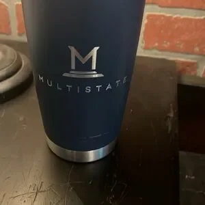 Sleek YETI tumbler in dark blue. Features silver trim. Ideal for temperature control. Missing Mag Slider. Engraved Multistate on one side.