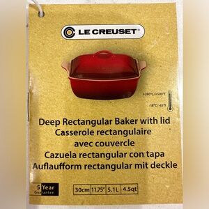 Durable and stylish. This (NWT), Le Creuset piece is crafted in France from stoneware. It’s tag indicates a 5 year guarantee. Oven and Freezer safe!