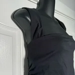 Stylish black tank top by Maeve Anthropologie. Ideal for casual wear. Soft fabric. Features: unique square neckline, sleeveless, built in bra, ruched sides. Size medium new with tags