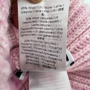 Lightweight rib knit wool- and recycled wool-blend beanie in pink. Logo patch at rolled brim. Preowned item in excellent overall condition. No odors, stains, or holes.