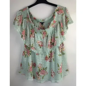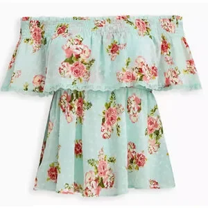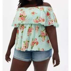 Torrid Off Shoulder Sheer Lace Swiss Dot Top Plus Size 2 2X Green Pink Boho Chic