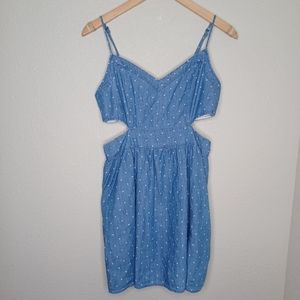 Stylish mini dress with delicate polka dots. Features thin straps and side cut-outs. Ideal for casual wear.