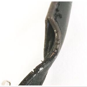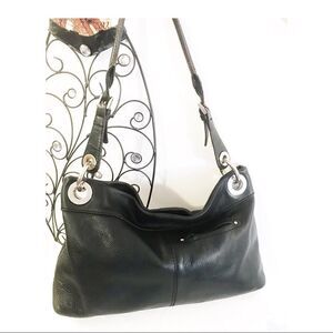 Smooth and sleek B. Makowsky black leather shoulder bag. Gathered center front with zippered pocket. One small rear pocket, perfect for phone or car key. Shoulder strap with accent bucket and strap with eyelet and loop silver hardware. Classic B. Makowsky brown and black animal print cloth interior. Zippered pocket and two open. Magnetized closure on main opening. No cuts or tears, but there is slight cracking on shoulder strap (see pic) hard to notice unless looking for it