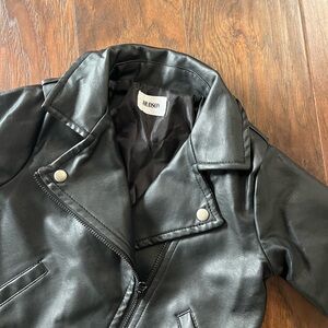 This is a very gently used and in near perfect condition toddler bomber jacket. On the left side of the collar there is a very small silver mark. I have shown this in the pictures it’s not noticeable unless you’re looking at this very closely. Stylish black faux leather jacket with red striped cuffs. Perfect for a trendy look for your little superstar! All of my items are well cared for and come from a smoke free home.