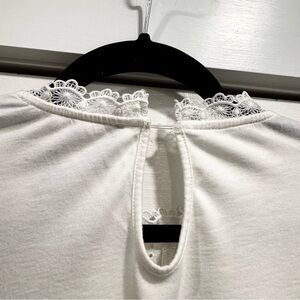 Elevate your wardrobe with this exquisite James Coviello white lace top in size medium. Featuring intricate lace details, a delicate keyhole back, and a high neckline with scalloped trim, this piece exudes timeless elegance. Perfect for formal events, brunches, or layering, this top combines comfort and style with its blend of polyester, cotton, and modal fabrics. A must-have for anyone who appreciates fine craftsmanship and versatile fashion