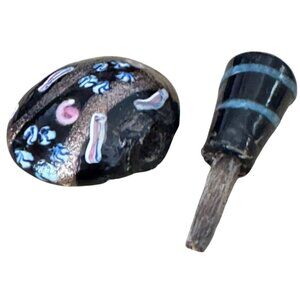 This Venetian Millefiori glass perfume bottle from the early 1900s features a vibrant black and gold tone adorned with intricate patterns of pink, blue, and metallic accents. Its wooden dauber provides practicality and vintage appeal. Measuring approximately 1 3/4 inches tall, this antique showcases traditional Millefiori craftsmanship. Ideal for collectors or decorative use. This was probably a souvenir when it was made.