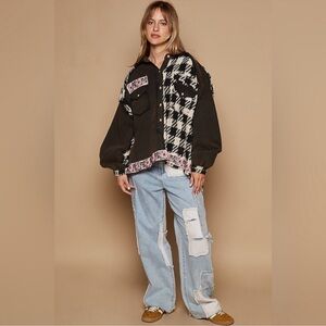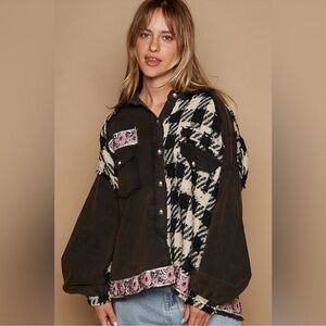 70. NWOT POL Black & Cream Plaid w/Floral Trim Button Down Shirt Shacket