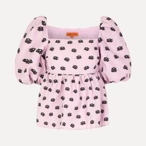 AIRY PEPLUM TOP WITH A SQUARE NECKLINE, PUFFED SLEEVES AND FLORAL PATTERN ON BLUSHED FABRIC. RECYCLED POLYESTER BLEND. PAIR WITH THE MATCHING ISRA PANTS IN PEONIES.
