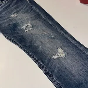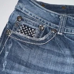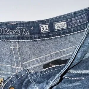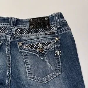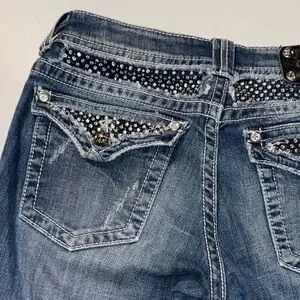 Chic Miss Me skinny jeans with distressed details. Dark blue hue for a modern look. Perfect for casual wear.