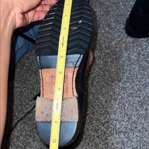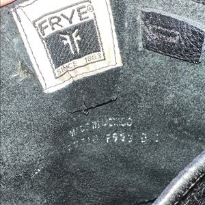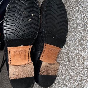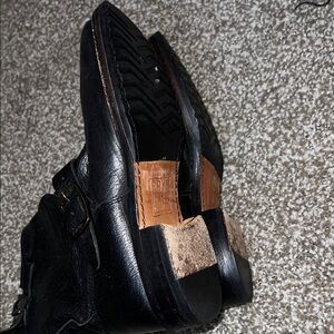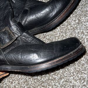 Sleek Frye ankle boots. Made from black leather. Features bold buckle details. Have been repaired. Size is no longer visible but should be a size 7, measurements included in photos as well.