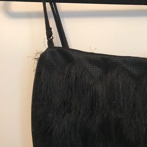 This fringe dress can be worn strapless or with straps. Heavier, sweater material. The fabric has stretch to it. 13 in at waist, 24 in at bust, 28 in at hips. 32 in from top hem to bottom hem.