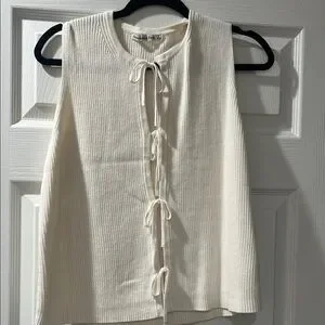 Elevate your style with this chic cream sleeveless top. Featuring a stylish tie-front design, it's perfect for any occasion. Purchased but never worn. Beautiful sweater like material. Can be dressed up or down. Sleeveless and can be worn with a top underneath. Size large. Excellent condition. Non-smoking, no pet home.