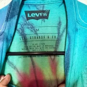 Levi's shirt with a vibrant tie-dye pattern. Features a mix of blue, red, and yellow hues. Can be uses for both sex