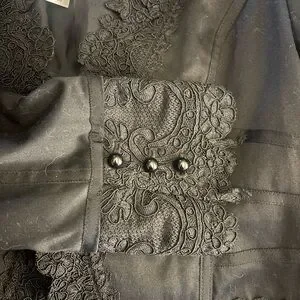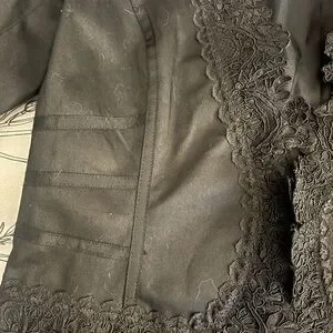 Chic black blazer with elegant lace detailing. Ideal for a stylish, sophisticated look.