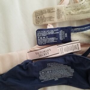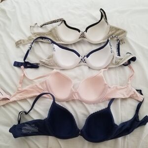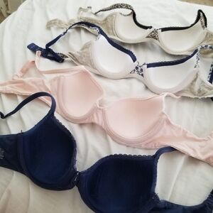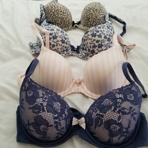 Cute bra set featuring leopard print, blue floral, pink stripes, and navy lace. Stylish and comfortable for any occasion. Bundle of 4. They all fit 32b regardless of what the tag indicates. The tag says 32b, 32c, 34a but they all fit a 32b chest.