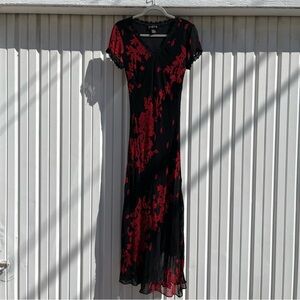 MAJICK vintage black sheer red floral sequin lace trim short sleeve midi maxi