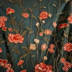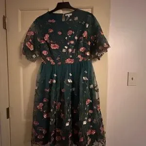 Elegant green midi dress with floral embroidery. Features sheer sleeves and a fitted waist. Perfect for special occasions. Never tried it on! I have the same dress in two other colors and didn’t realize it lol.
